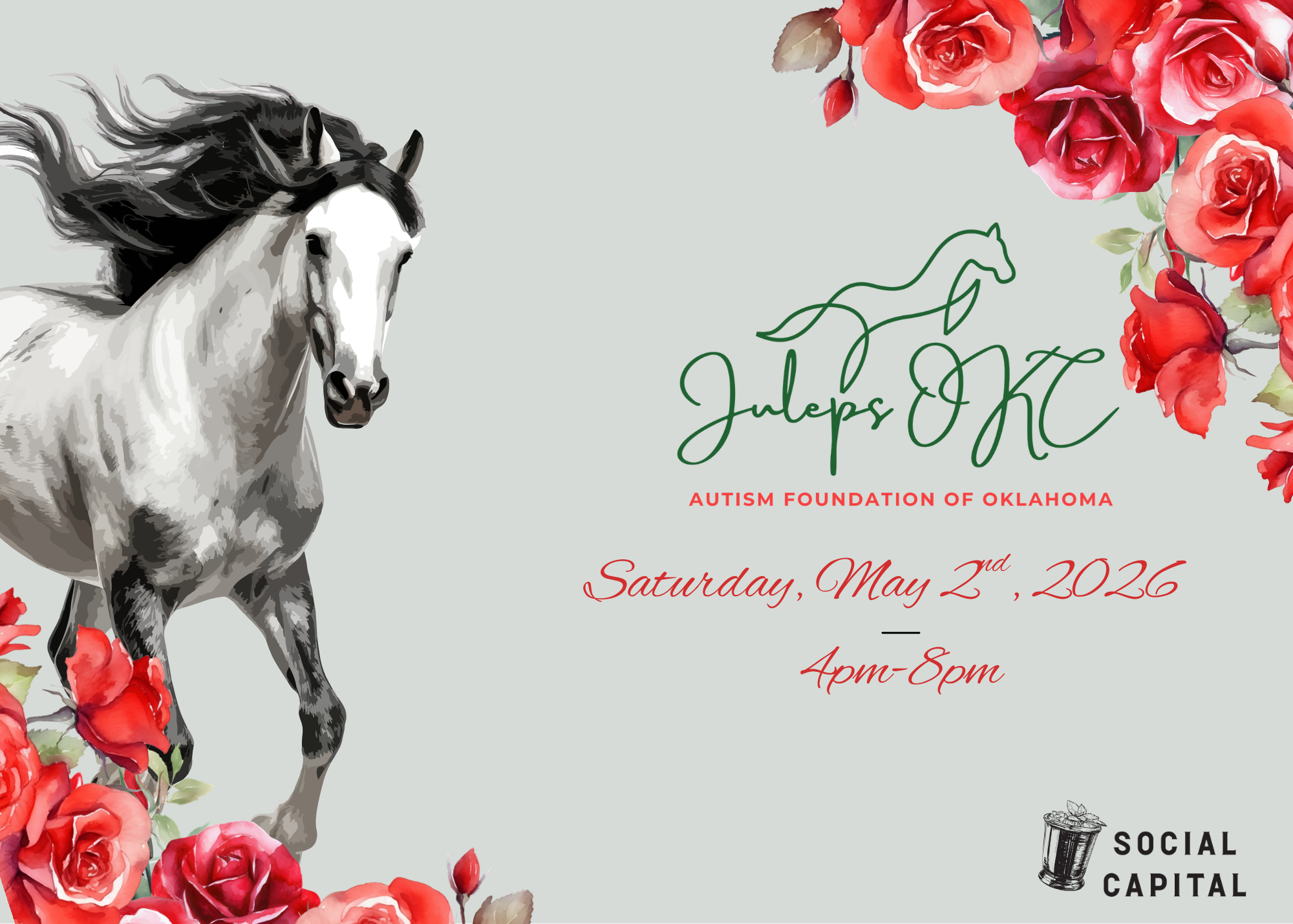 Join us for an exciting Kentucky Derby watch party benefiting the Autism Foundation of Oklahoma on Saturday, May 2nd, 2026, from 4:00 PM to 8:00 PM. This event will take place at Social Capital, overlooking Scissortail Park in downtown Oklahoma City.